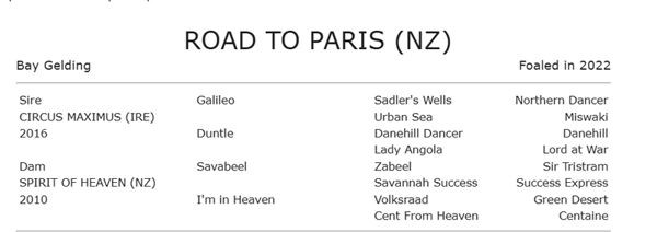 Bred and raced by Ron and Judi Wanless, Road To Paris is out of the four-time winning Savabeel mare Spirit Of Heaven, who is a three-quarter sister to Gr.1 Schweppes Oaks (2000m) winner Lights Of Heaven.